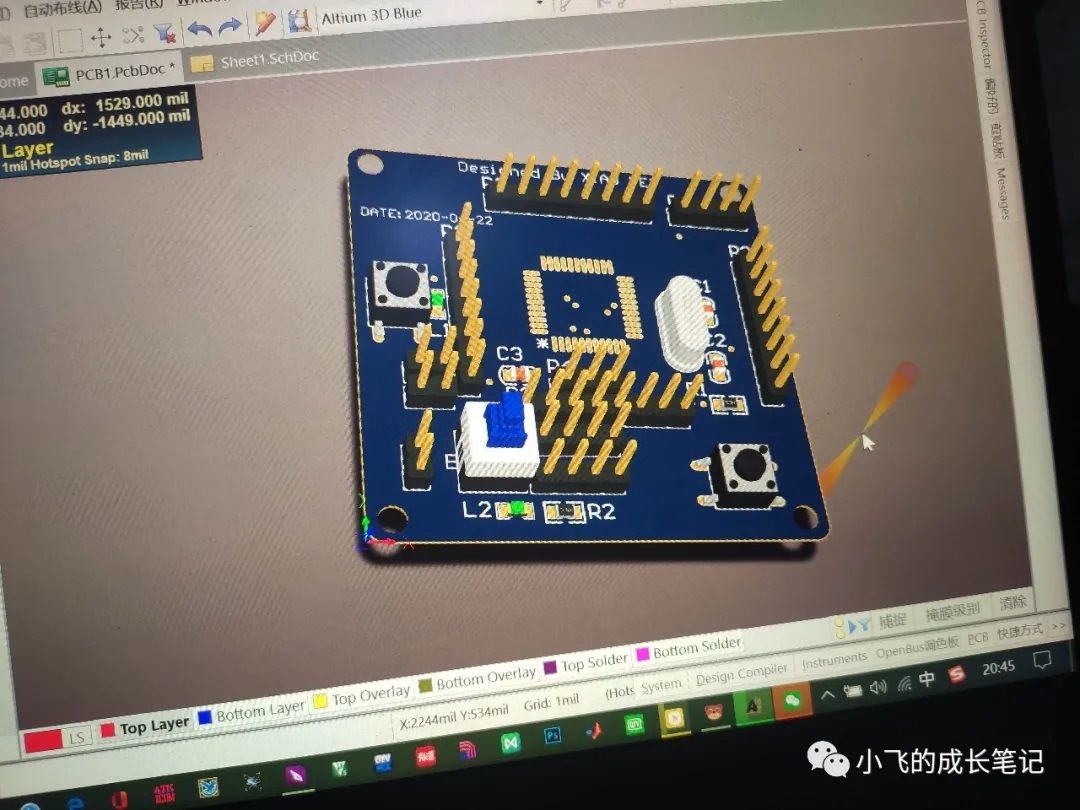 然后又花了半天时间发现问题,解决问题,然后就突然什么都明白了,也理解了元件库,封装库,原理图和pcb文件之间的关系,也学会了自己画封装库和元件库,一切好像都是水到渠成。最后就又花了几天的时间绘制并打样了我的第一块电路板(不得不说,嘉立创的五元包邮的板子真的太香了)。