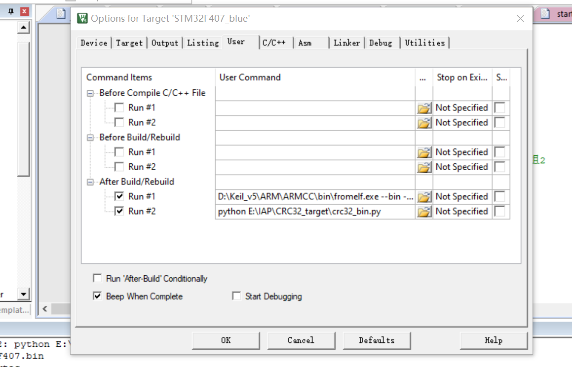 3、然后是对Keil进行配置,实现编译,生成bin文件和加入CRC校验可以一步完成;